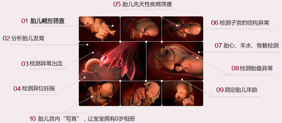 美国GE四维彩超。它用出色的人 体工程学设计,不存在电离辐射和电磁辐射,对人体组织没有任何 影响。而且医学使用的超声属于低强度,低于94毫瓦/立方厘米,对 胎儿是没有危害,并且至今尚没有引起胎儿致畸的报道。由此可见, 美国GE四维彩超可以带给宝宝和孕妈妈们保 障,免除了后顾之忧。 点击预约检查>>>
